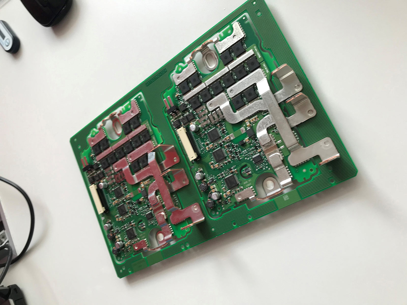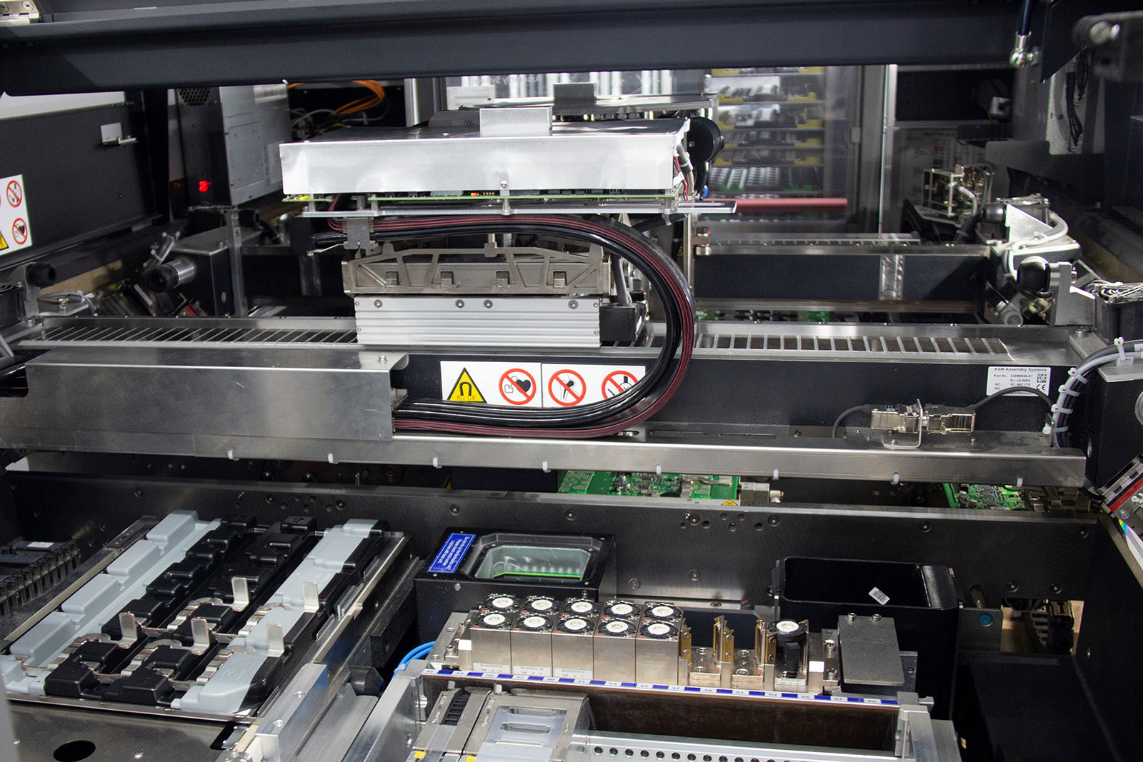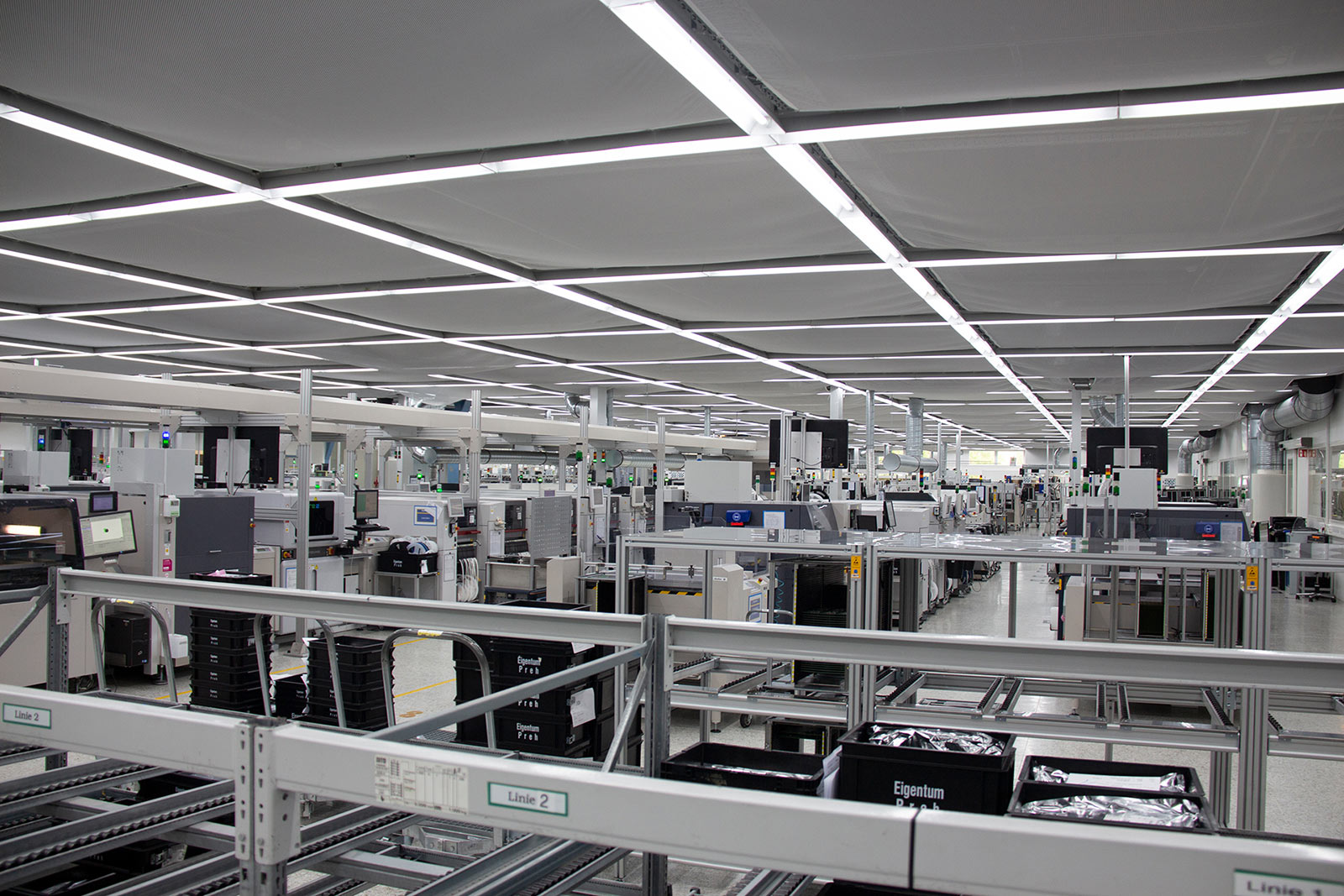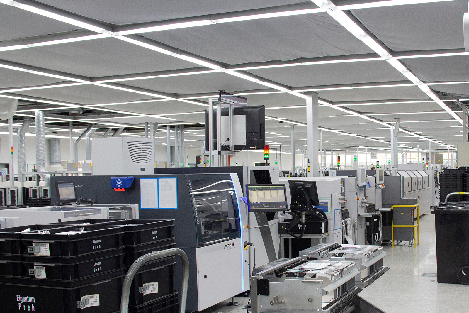 La produzione di massa è recentemente iniziata con tre turni. I pannelli vengono fatti funzionare in gruppi di due su una linea SMT a binario singolo dotata di tre macchine SIPLACE SX2. Le prime due macchine posizionano i componenti SMT, mentre la terza macchina movimenta le sbarre. È dotato di due scambiatori di waffle per l’alimentazione delle sbarre, una testa SIPLACE TwinStar HF (High Force) e una testa SIPLACE TwinStar VHF (Very High Force). La testata VHF posiziona le due sbarre grandi mentre la testata HF posiziona le due più piccole. Per motivi di processo, i pad di saldatura sono stati ingranditi e la forza Z per posizionarli è stata aumentata. Preh impiega anche un forno a vuoto su questa linea per ridurre al minimo il rischio di inclusioni d’aria.