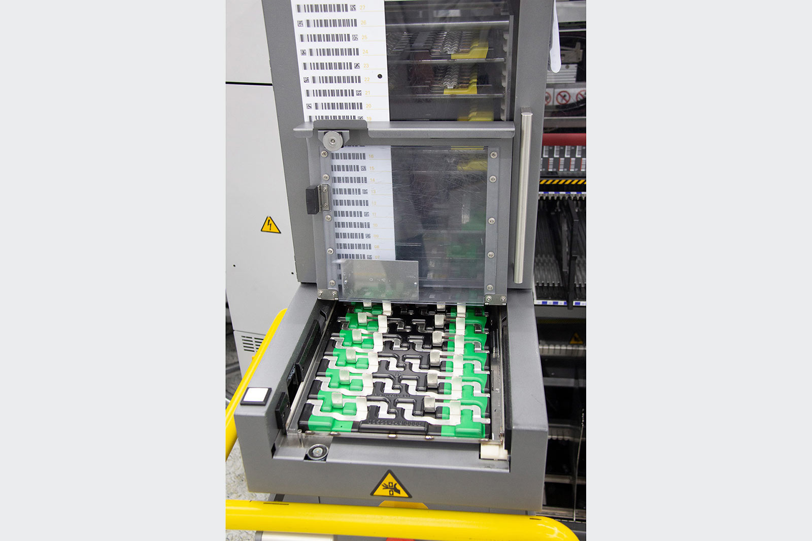 Nel corso di diverse iterazioni, il team di Preh è riuscito a ottimizzare i vassoi e l’intero processo di approvvigionamento dei componenti: “Oggi utilizziamo vassoi termoformati che contengono più set completi delle quattro diverse sbarre. Lo abbiamo fatto integrando il nostro prefabbricatore nel processo, che ora ci consegna vassoi preriempiti. I codici assicurano che il sistema di visione possa distinguere le sbarre e i fori nelle sbarre vengono utilizzati come contrassegni per garantire captazioni centrate con precisione. Le sbarre sono immagazzinate nei vassoi in modo da eliminare la necessità di ruotarle. Il loro posizionamento sulla scheda è supportato da pin. Per gestire i vassoi, che sono riempiti con diversi componenti, il team CoC di ASMPT è entrato nuovamente in gioco, riferisce Dirk Petzold. I tecnici hanno lavorato insieme per ottimizzare molti dettagli.